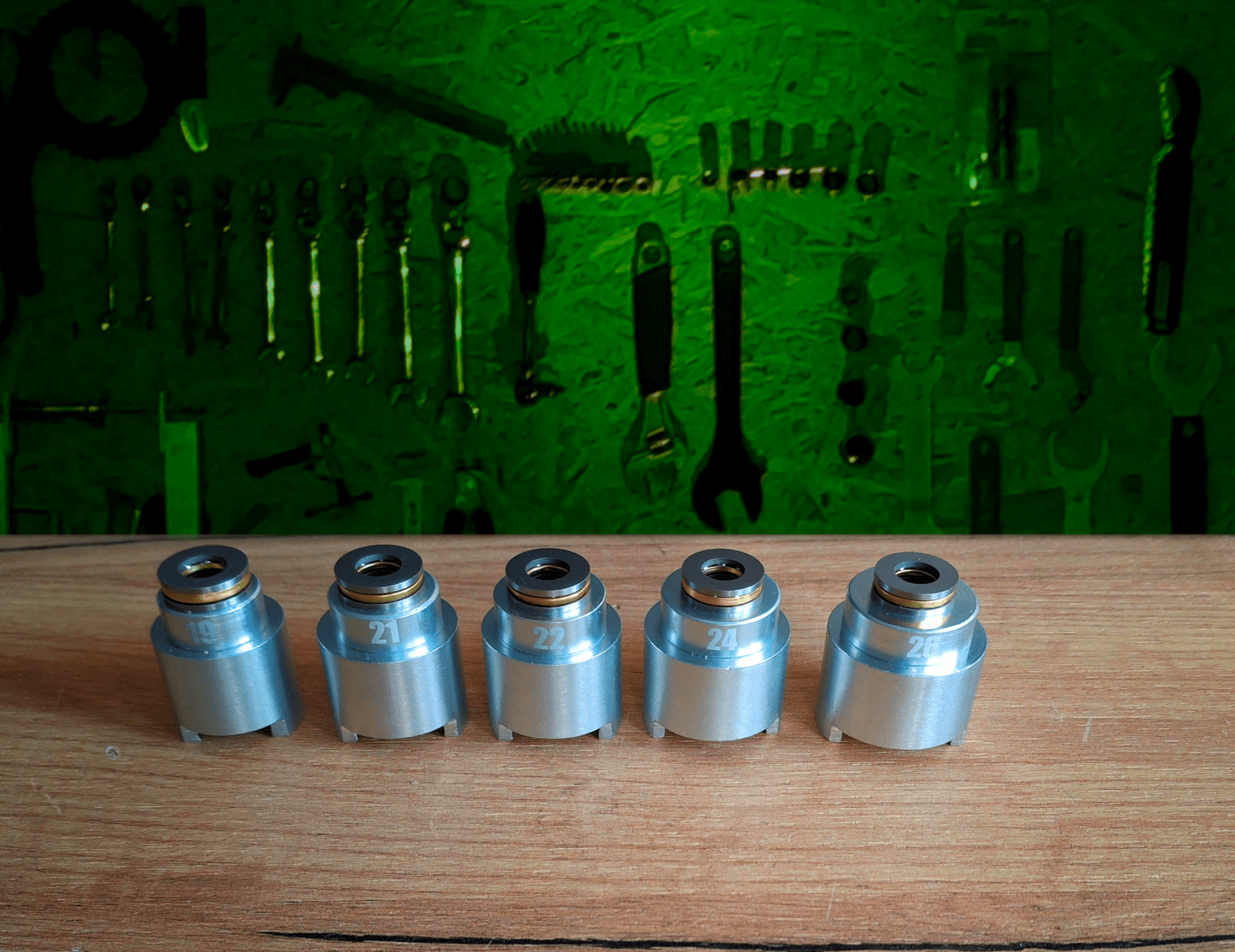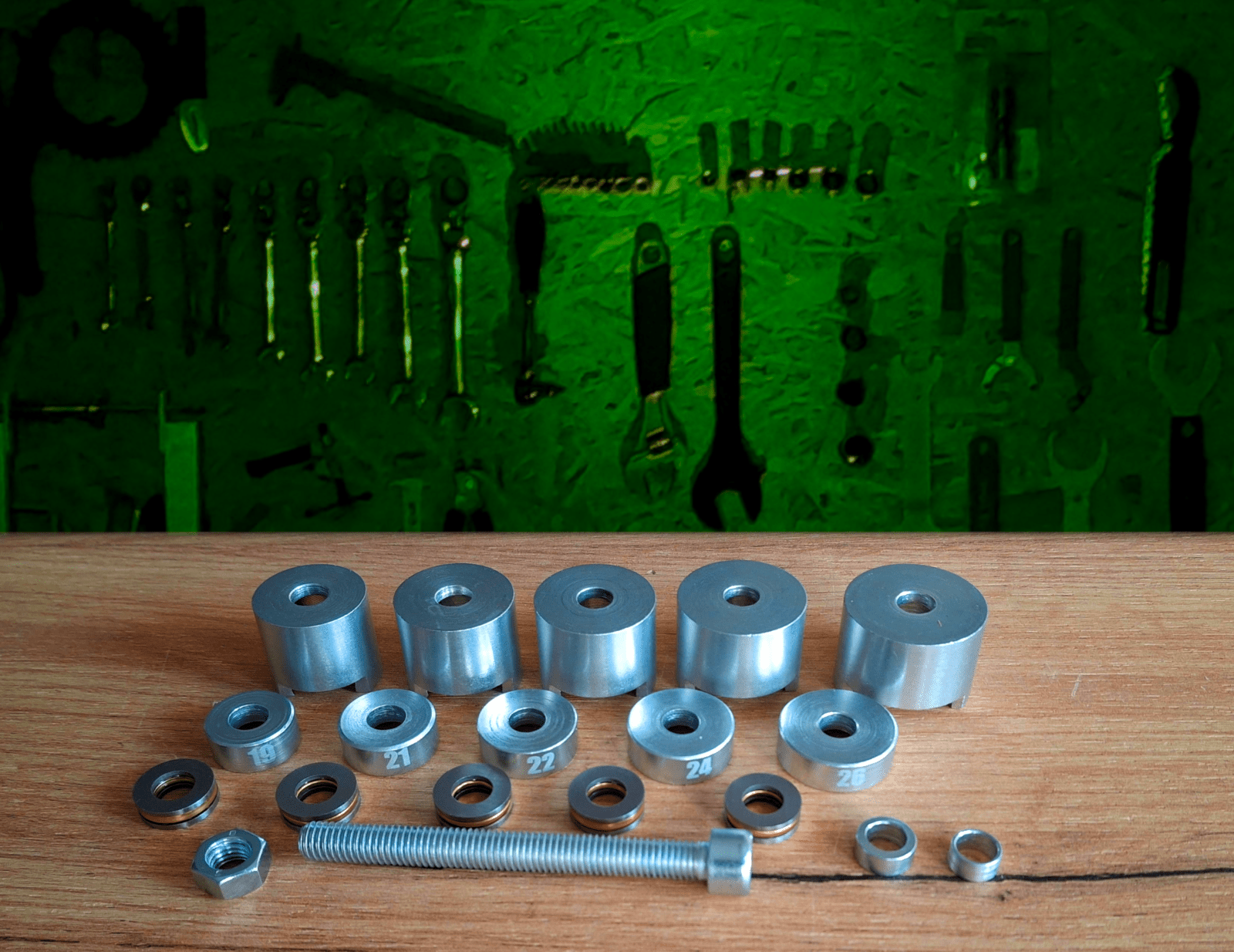Urządzenie zostało zaprojektowane, aby móc samodzielnie wymienić łożyska w zawieszeniu rowerowym. Za pomocą prasy będziesz w stanie zdemontować/zamontować łożysko o średnicy zewnętrznej między 19, 21, 22, 24, 26, oraz średnicy wewnętrznej od 8mm do 15mm. Specjalnie wykonane wycięcie w tulei zostało wykonane celem dotarcia do trudnodostępnych miejsc. Aby praca była precyzyjniejsza zaprojektowano tuleje redukujące, które minimalizują luz między śrubą, a łożyskiem. Zestaw został wykonany z metalu, co przekłada się na trwałość urządzenia.